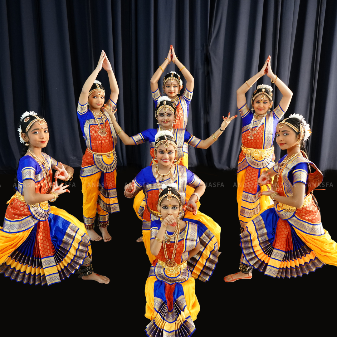 At ANASFA, we teach Bharatanatyam as it was meant to be learned – with reverence for tradition, depth in technique, and joy in expression. Our structured curriculum takes students from foundational adavus (basic steps) through complex jathis (rhythmic compositions) to full-length solo performances, all guided by experienced gurus who bring both artistry and pedagogical rigour to every class.